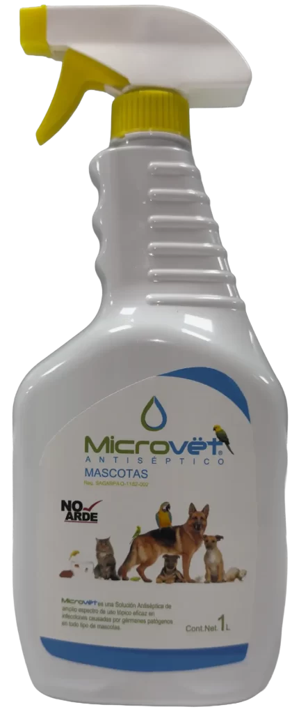 Microvët® Mascotas es una solución antiséptica de amplio espectro de aplicación tópica, diseñada como auxiliar en heridas para evitar y tratar contaminaciones por virus, hongos y bacterias.