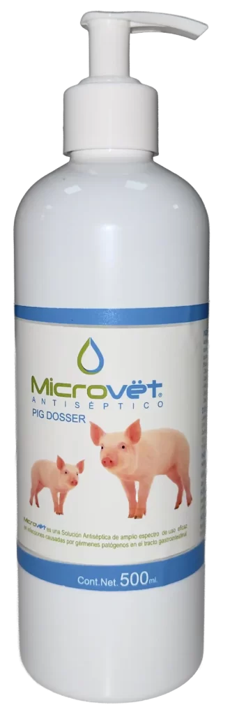 Microvët® Pig Dosser es una solución antiséptica de amplio espectro de aplicación oral, diseñada para tratar de manera efectiva enfermedades causadas por microorganismos que afectan el tracto gastrointestinal de Cerdos y otras especies.