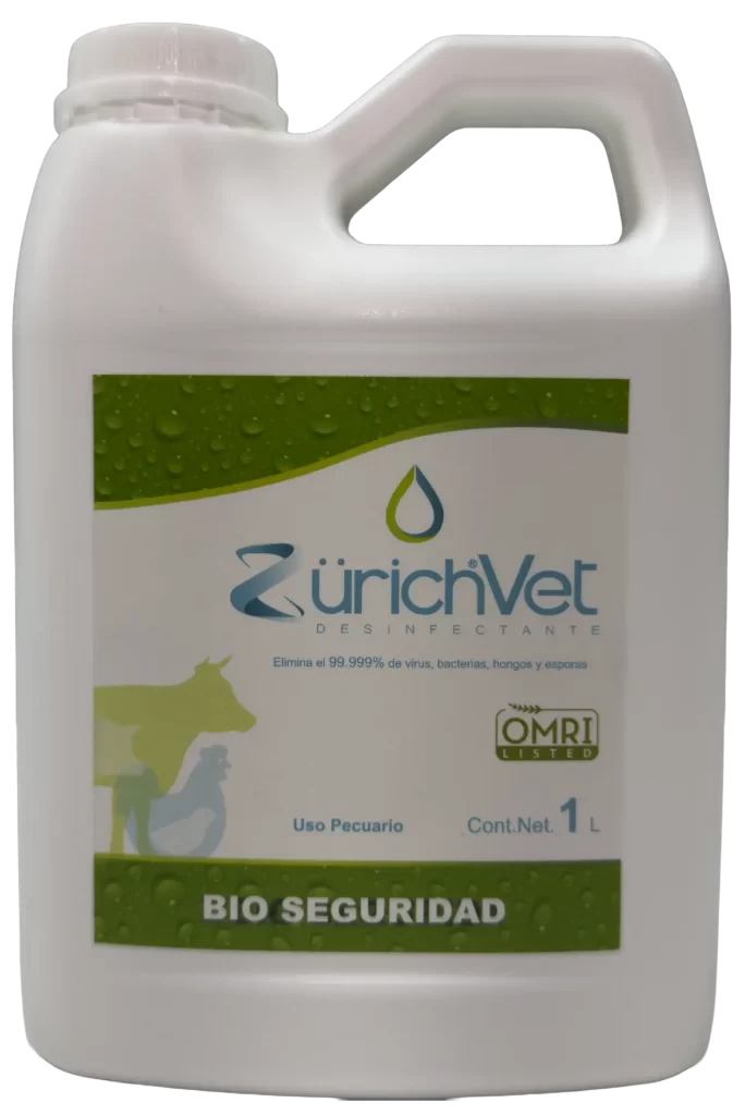 ZurichVet Desinfectante Pecuario es un desinfectante, elaborado a base de una Solución Electroquímicamente Activa con un pH neutro, elimina el 99.999% de virus, bacterias, hongos y esporas al contacto, es inocuo para los operadores, mejora los parámetros productivos coadyuvando en el bienestar y salud de nuestros animales.